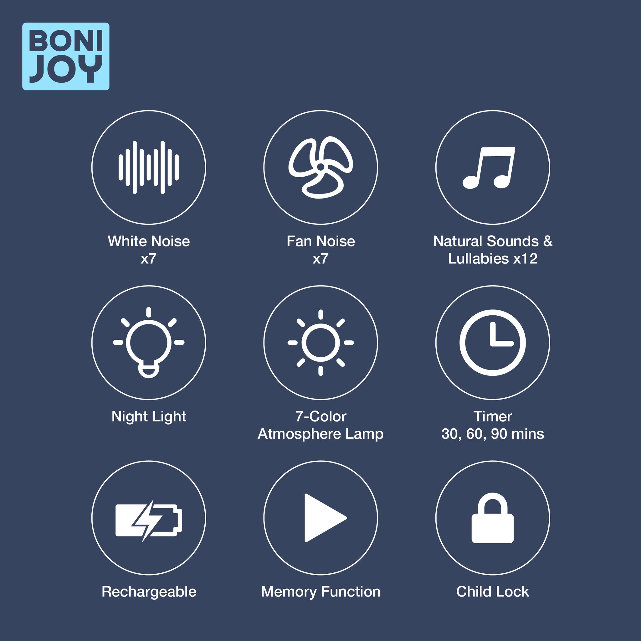 BONIJOY white noise maker create a consistent, soothing sound resembling a mix of frequencies. It is designed to mask disruptive noises, promote relaxation, and improve sleep.
